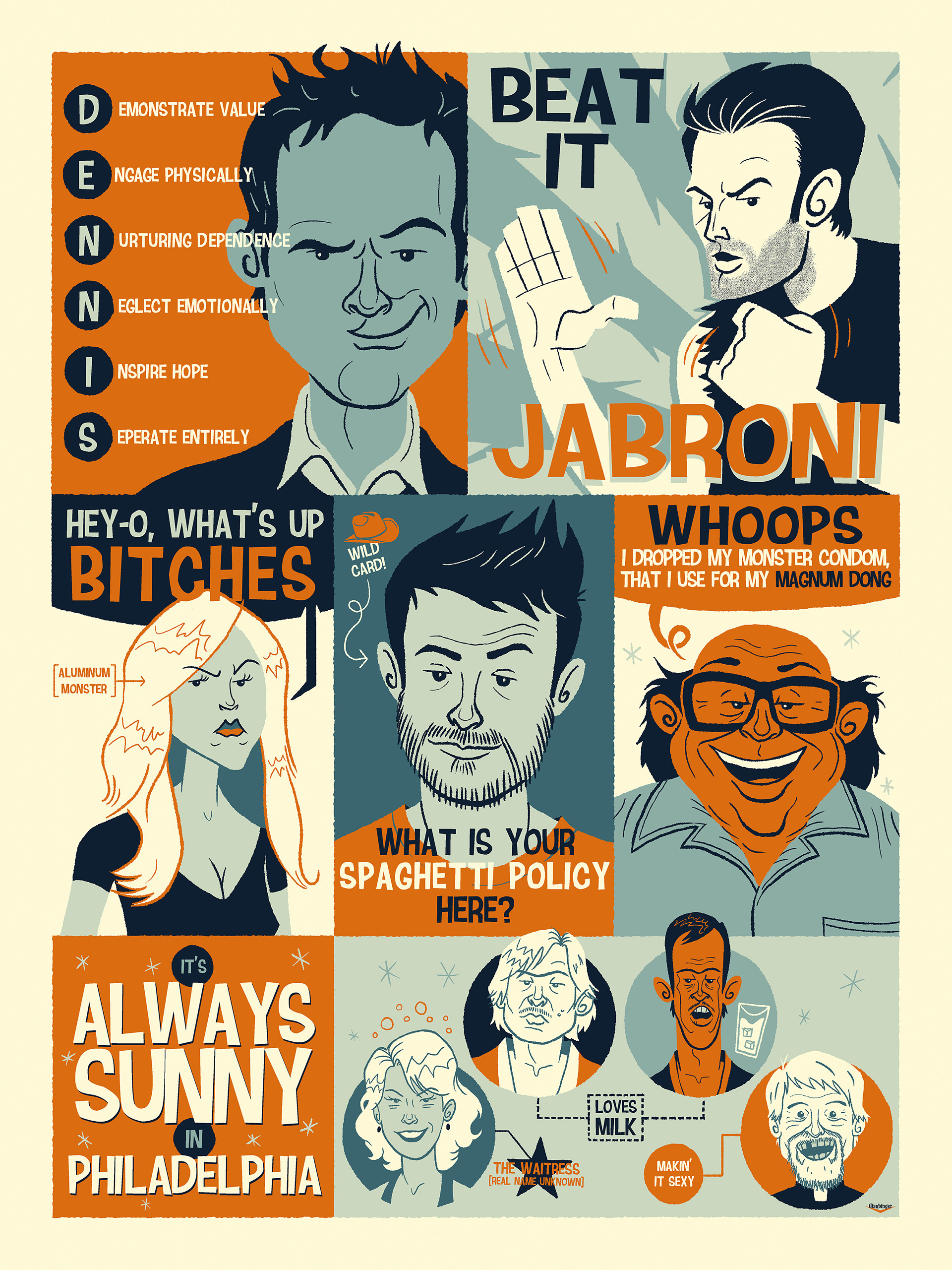 Officially licensed "It's Always Sunny in Philadelphia" poster based on the hit FX comdey series created exclusively for Acme Archives and DarkInkArt.com Print details: - 18"x24" - lithograph - numbered edition of 250 It's Always Sunny in Philadelphia & ™ © Twentieth Century Fox Film Corporation. All Rights Reserved. 2016