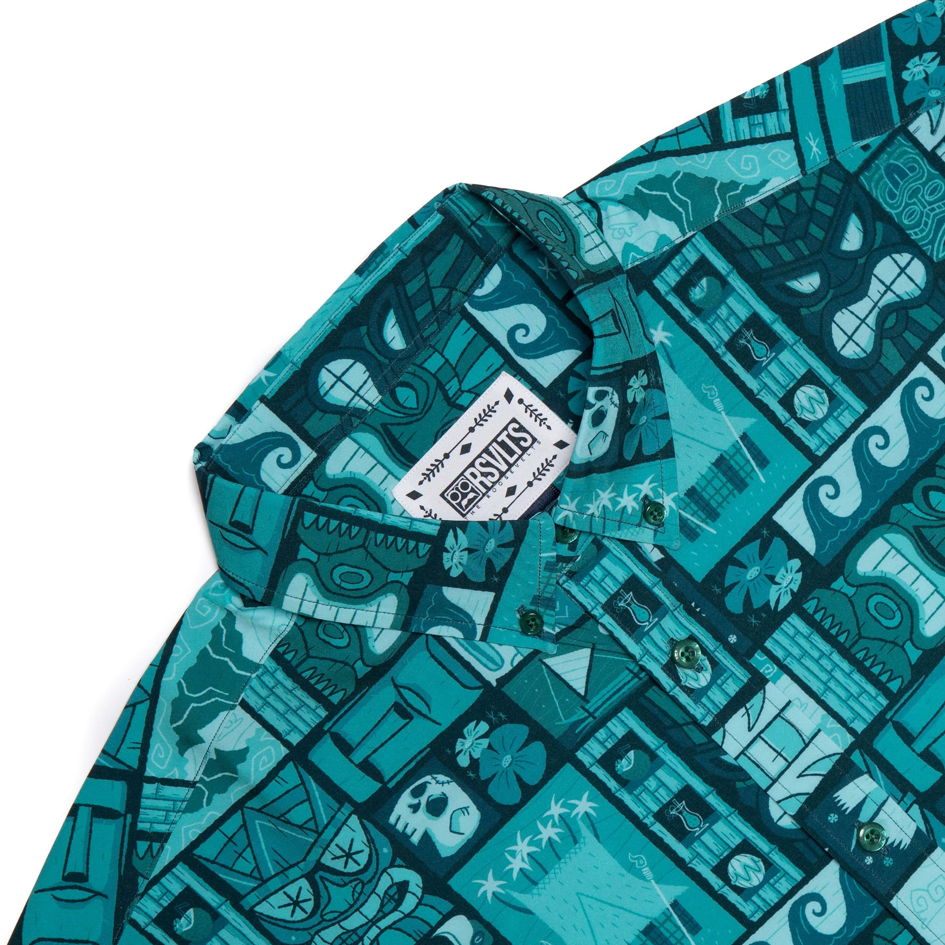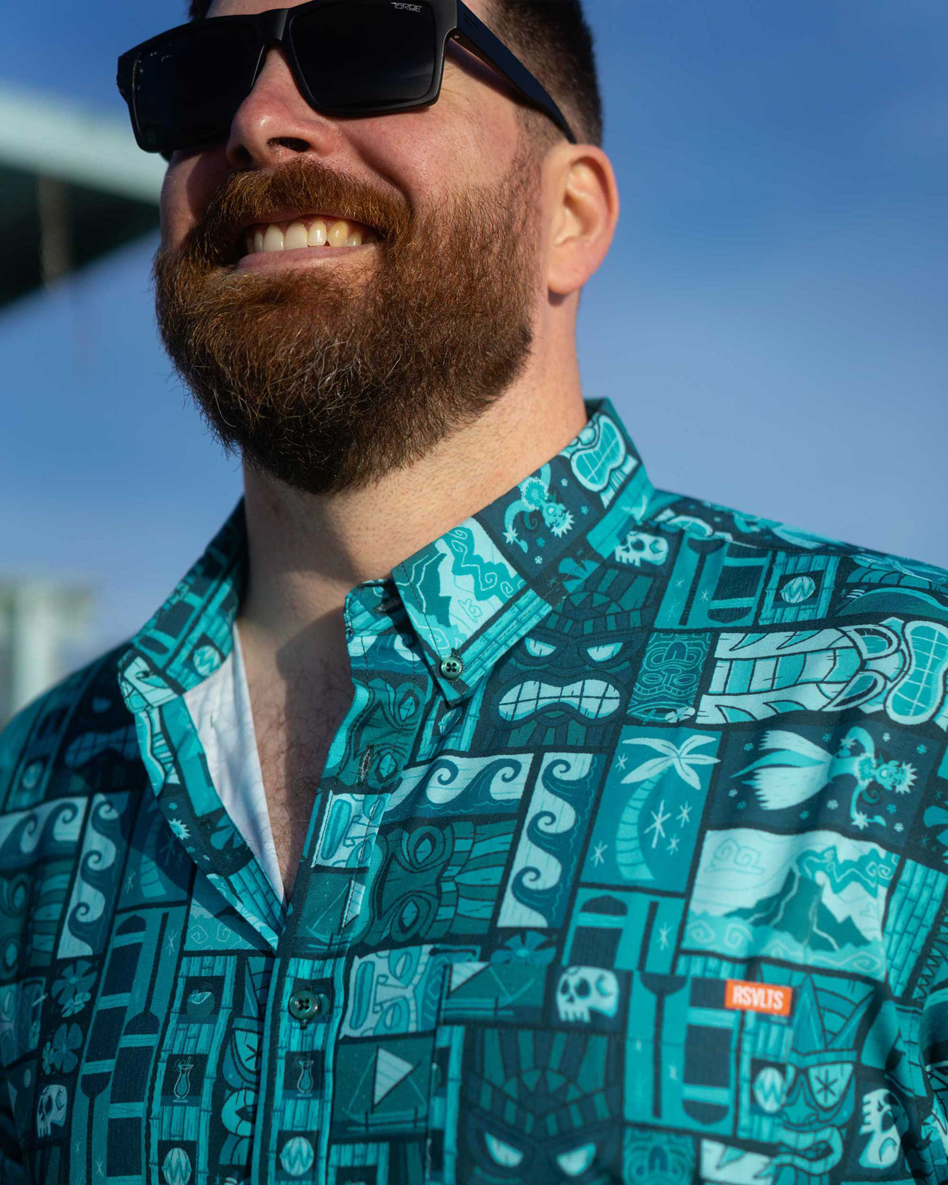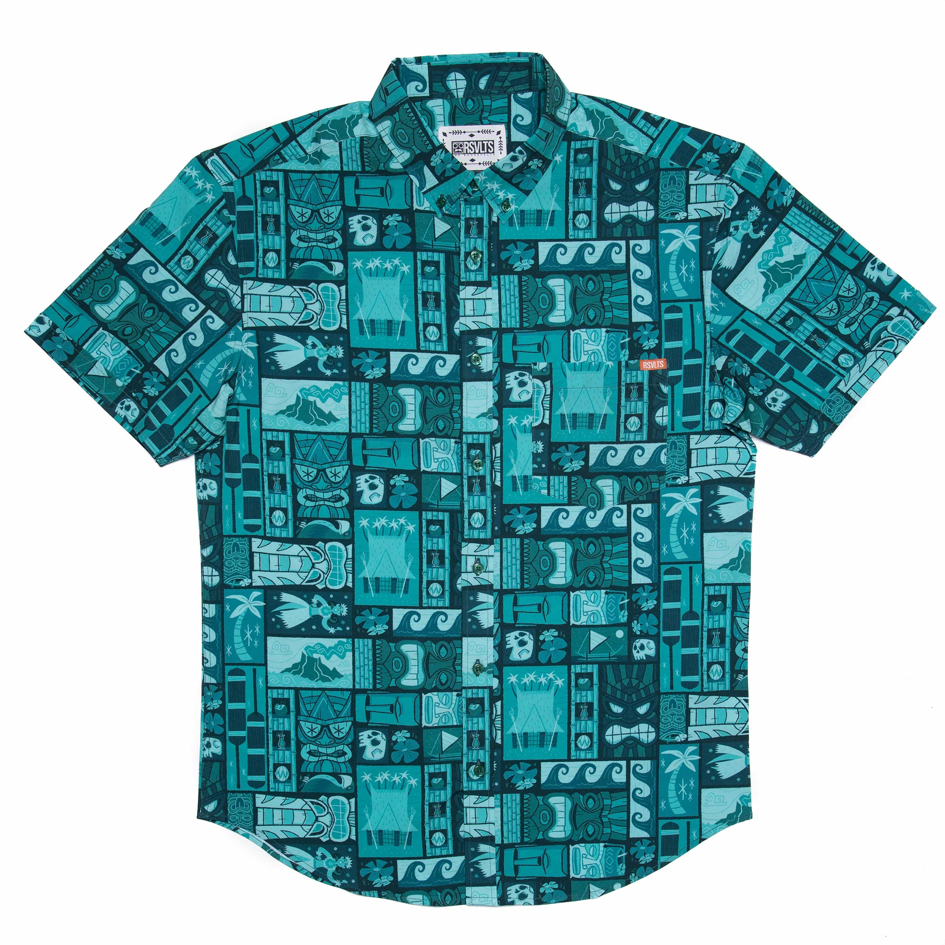 An original button down shirt design created exclusively for The RSVLTS. This Tiki or "Aloha shirt" design is inspired by Polynesian culture, heritage and Americana.