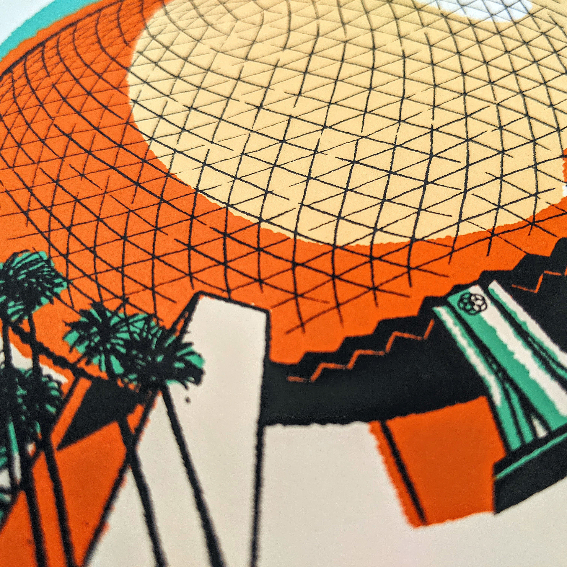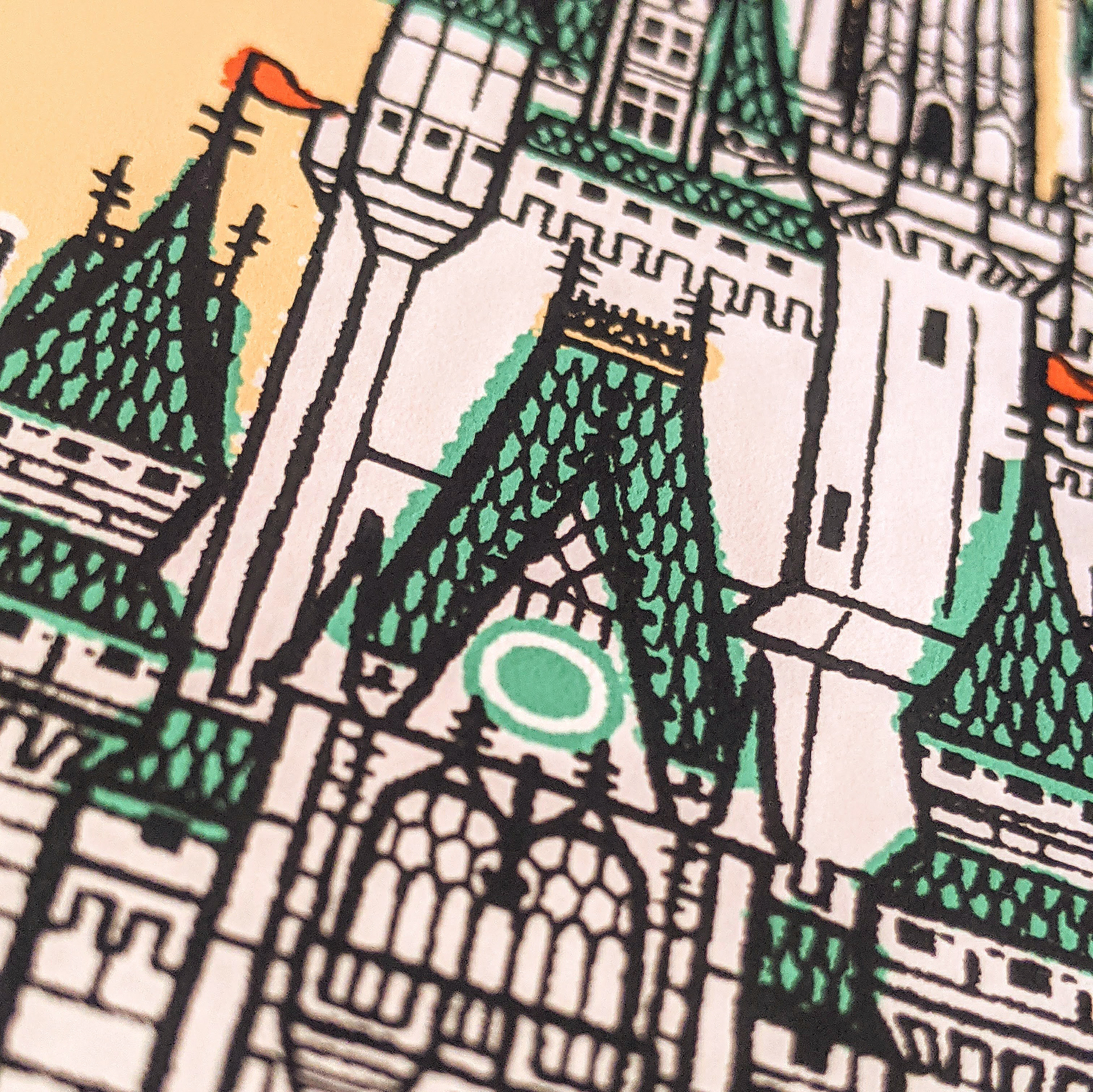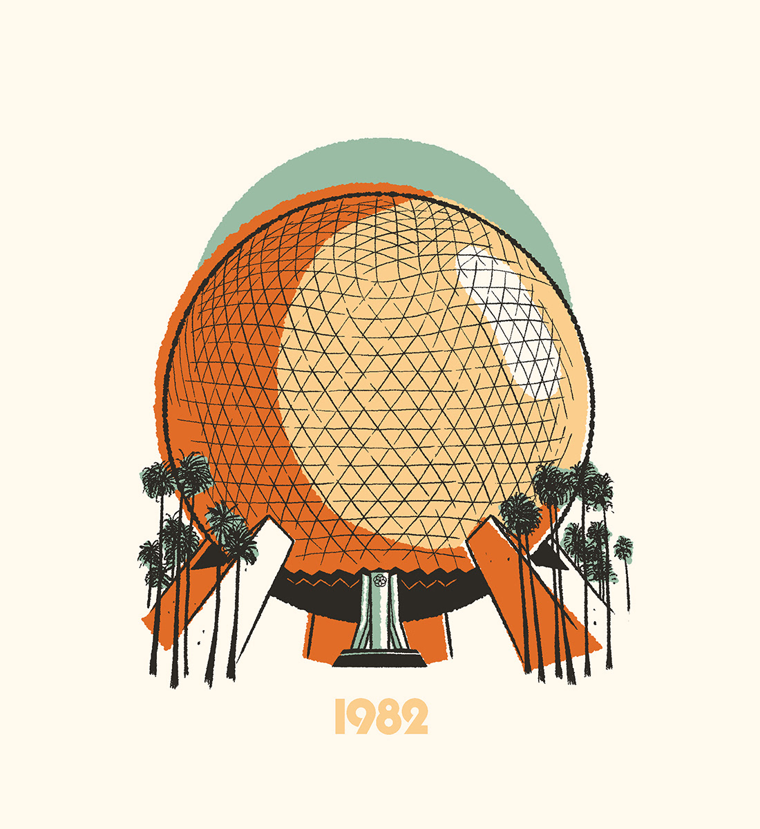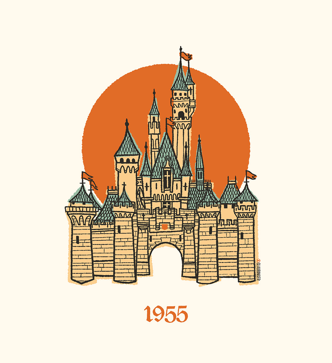 Limited edition screen prints inspired by Disneyland and Walt Disney World including Sleeping Beauty Castle, Cinderella Castle and Spaceship Earth from Epcot Center.