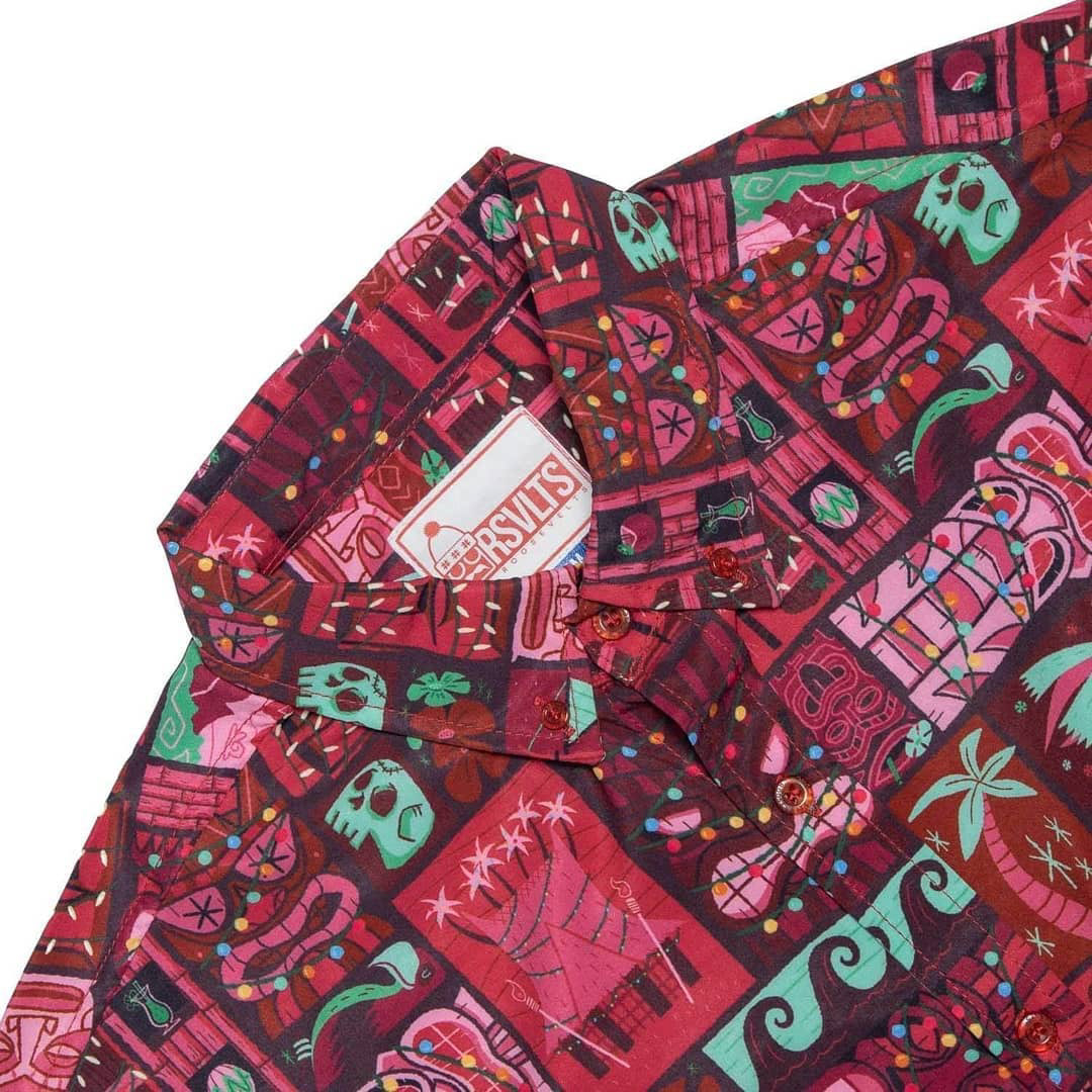 An original button down shirt design created exclusively for The RSVLTS. This holiday Tiki or "Aloha shirt" design is inspired by Polynesian culture, heritage and Americana.