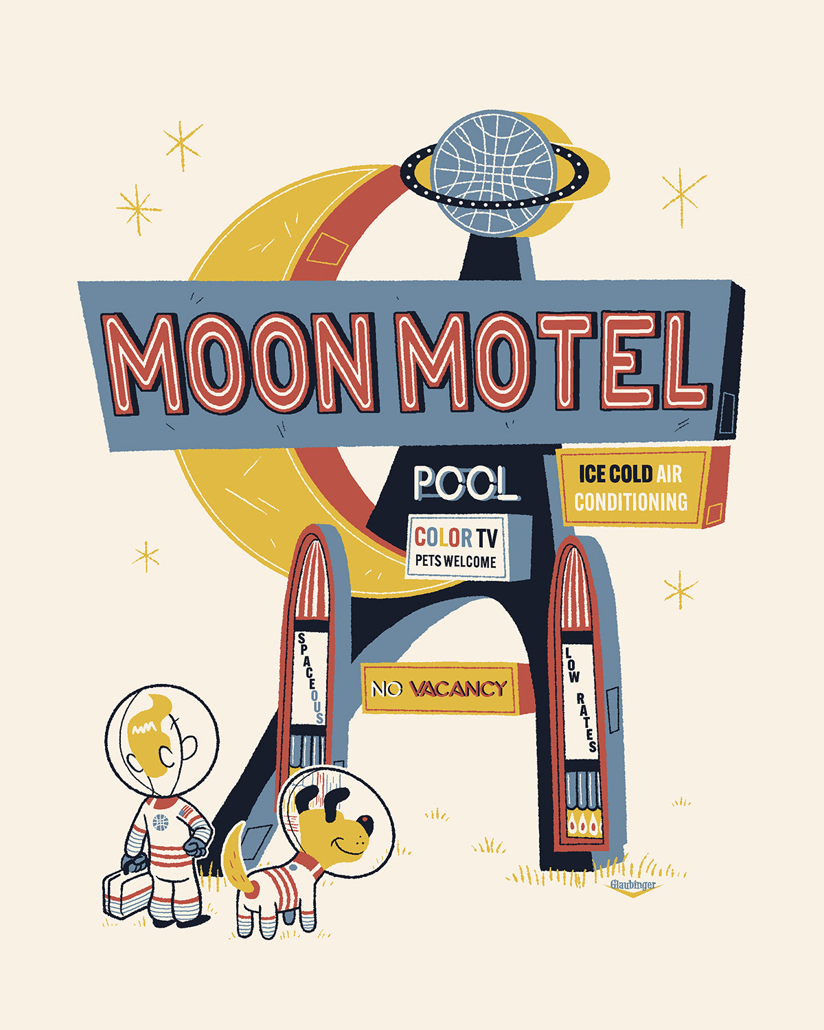 Inspired by the MOON MOTEL sign in Howell, NJ. It was always so cool looking so I decided to make a print inspired by it. The motel has been gone & bulldozed for years but the sign is still hanging around.