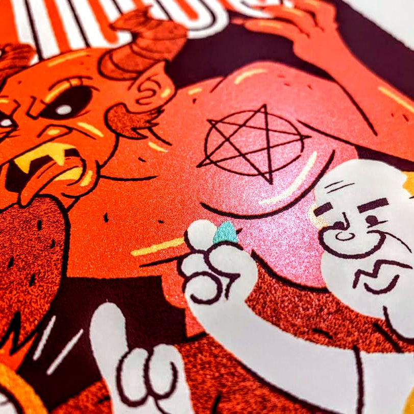 Limited edition screen print from the Gallery 1988 show Fake Gig Poster inspired by all things Tenacious D, Jack Black, Kyle Gass, Satan, rocket sauce and all things that ROCK.