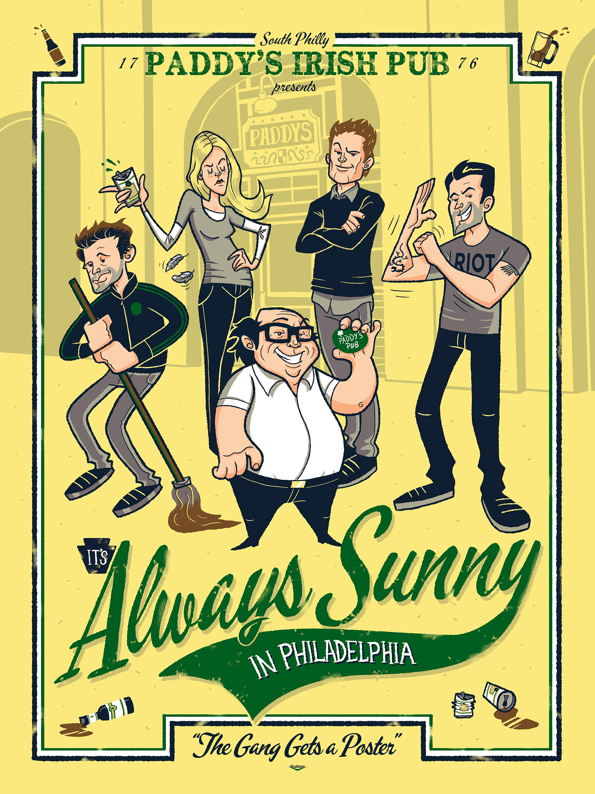 Officially licensed "It's Always Sunny in Philadelphia" poster based on the hit FX comdey series created exclusively for Acme Archives and DarkInkArt.com Print details: - 18"x24" - lithograph - numbered edition of 250 It's Always Sunny in Philadelphia & ™ © Twentieth Century Fox Film Corporation. All Rights Reserved. 2016