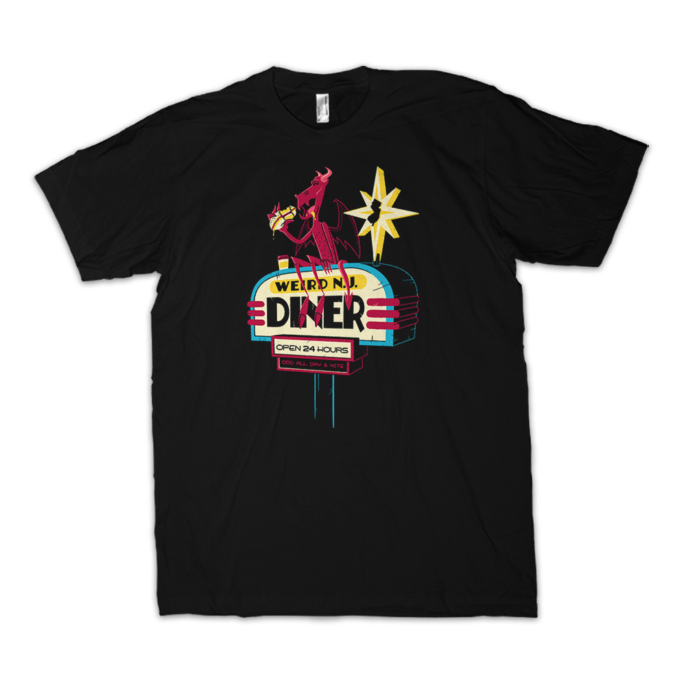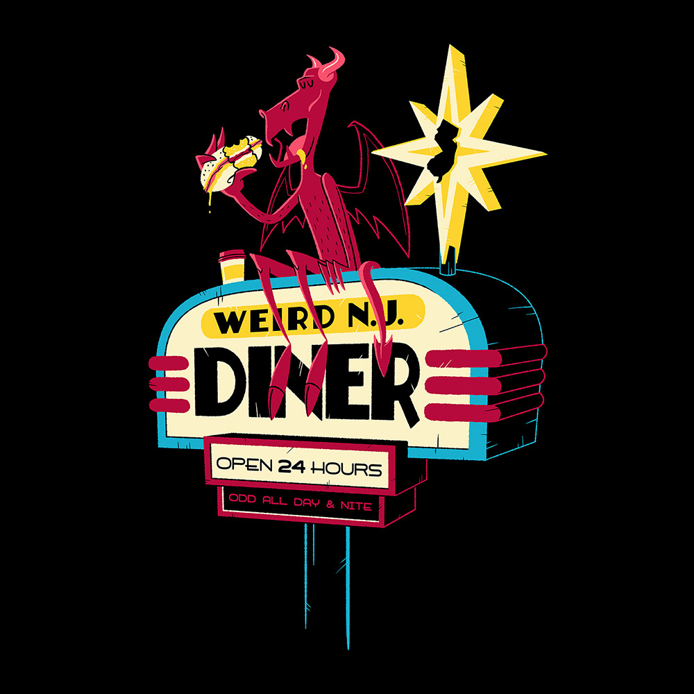 T-shirt design created exclusively for the cult magazine Weird NJ featuring the Jersey Devil chowing down on a pork roll (or Taylor Ham), egg and cheese at his local diner.